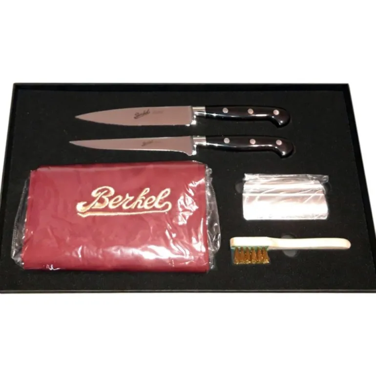 Composizione del set: 16 cm coltello cucina Adhoc Nero Lucido – 16 cm coltello disosso Adhoc Nero Lucido – Pinza prosciutto – Grembiule rosso – Spazzola pulisci smerigli