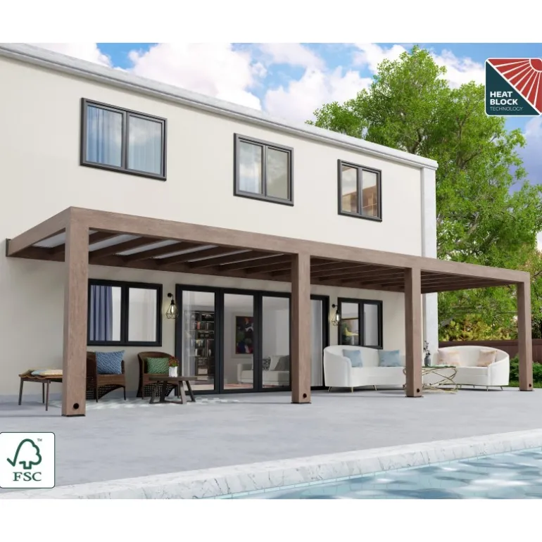 Quando ami l’ambiente che ti circonda, sei naturalmente portato a trascorrere più tempo in esso. La Copertura per Terrazza in Legno Helsinki incarna questo concetto, raggiungendo quel perfetto equilibrio tra praticità e bellezza. Non solo protegge te e i tuoi mobili dalle intemperie, ma crea uno spazio dedicato al relax e al piacere. La bellezza naturale del legno di cedro aumenta il fascino della tua area abitativa all’aperto, creando un’atmosfera calda e accogliente perfetta per ospitare una festa o goderti un momento di tranquillità all’aperto.La resistenza intrinseca del legno di cedro di alta qualità alla marcescenza, al degrado e ai parassiti lo rende una scelta eccellente per una copertura per terrazza all’aperto. La struttura massiccia con un design elegante e minimalista presenta grandi pali con grondaie integrate e pannelli del tetto Solar Control grigi, a prova di perdite, che ti permettono di goderti il tuo spazio all’aperto tutto l’anno, rimanendo fresco in estate e asciutto e protetto in inverno.Progettata pensando alla convenienza, la Copertura per Terrazza in Legno Helsinki è semplice da installare e facile da mantenere. Non c’è bisogno di riverniciarla per cinque anni, il che significa che puoi dedicare meno tempo alla manutenzione e più tempo a goderti il tuo spazio. Respira profondamente, siediti e goditi il posto in cui ti trovi.