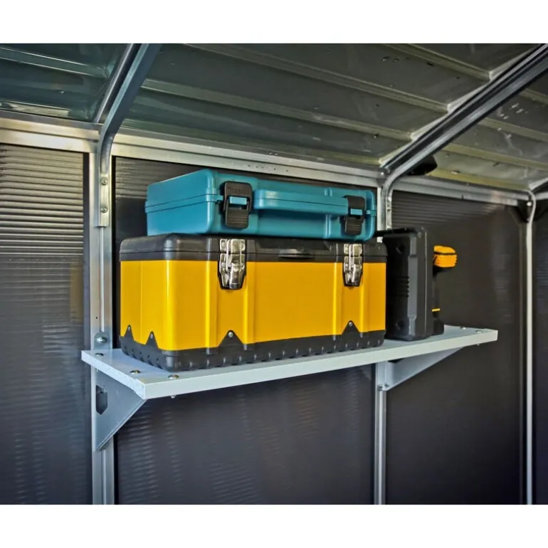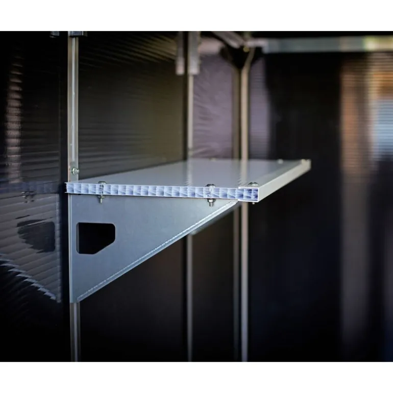 Ottimizza il tuo spazio ripostiglio con questo kit di scaffali SkyLight. Si tratta di un kit all-inclusive, che viene fornito completo di uno scaffale in policarbonato di alta qualità da 16 mm, due staffe in acciaio galvanizzato e hardware. Questo scaffale ti permette di liberare lo spazio a terra di cui hai bisogno e di organizzare in modo efficiente il tuo capanno. Il ripiano può contenere fino a 30 kg; è progettato per essere montato sul telaio in alluminio della serie SkyLight Shed