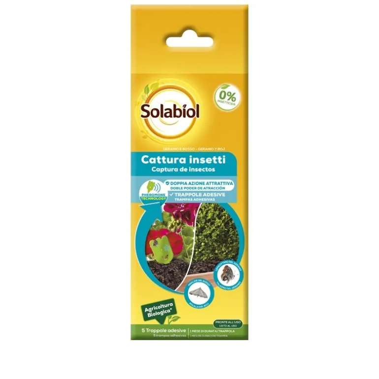 La trappola adesiva Cattura Insetti è l’innovativa soluzione naturale per la cattura ed il monitoraggio del lepidottero del geranio (Cacyreus marshalli) e della piralide del bosso (Cydalima perspectalis). La trappola richiama naturalmente gli insetti nocivi per il geranio grazie al suo colore verde; l’azione cromotropica, combinata con la presenza del feromone di attrazione specifico, la rende inoltre particolarmente adatta al monitoraggio degli insetti nocivi per il bosso. La trappola è resistente alla pioggia e agli agenti atmosferici, garantendo fino a un mese di efficacia.