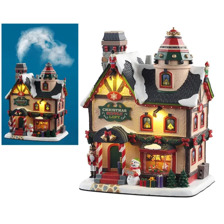 Lemax Christmas Supply Loft Effetto Fumo Cod. 15741 misura cm 18.5 x 14 x 23.4h, è composto principalmente in Poliresina e dispone di un proprio alimentatore nella confezione.