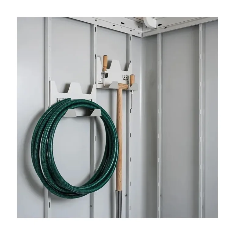 Ganci porta attrezzi per Casetta NEO realizzati in piastra in acciaio zincata a caldo, con rivestimento grigio bianco. Ideali per vanghe, rastrelli, tubi flessibili, utensili e molti altri utensili. Set da 2 pezzi