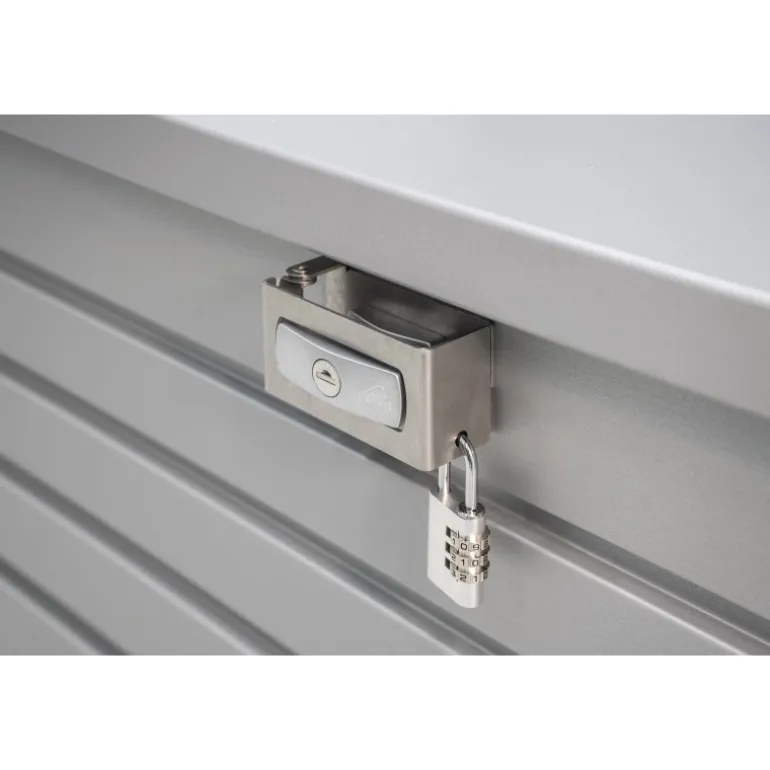 - Staffa di bloccaggio in acciaio inox e lucchetto in acciaio inox con combinazione numerica