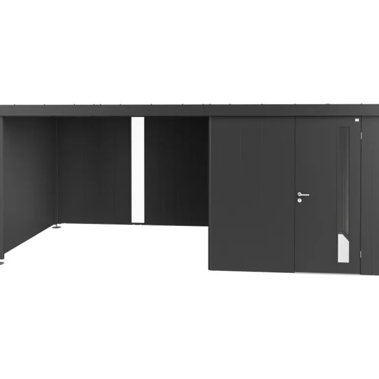 L’elemento vetro acrilico oscurato per tettoia laterale, in tinta con il colore della Casetta NEO, è integrato in un telaio in metallo e può essere installato in modo flessibile in qualsiasi parete laterale, ma non affiancato a elementi dello stesso tipo.