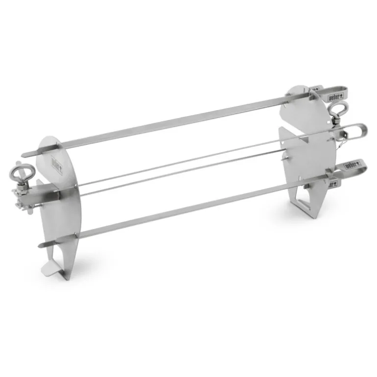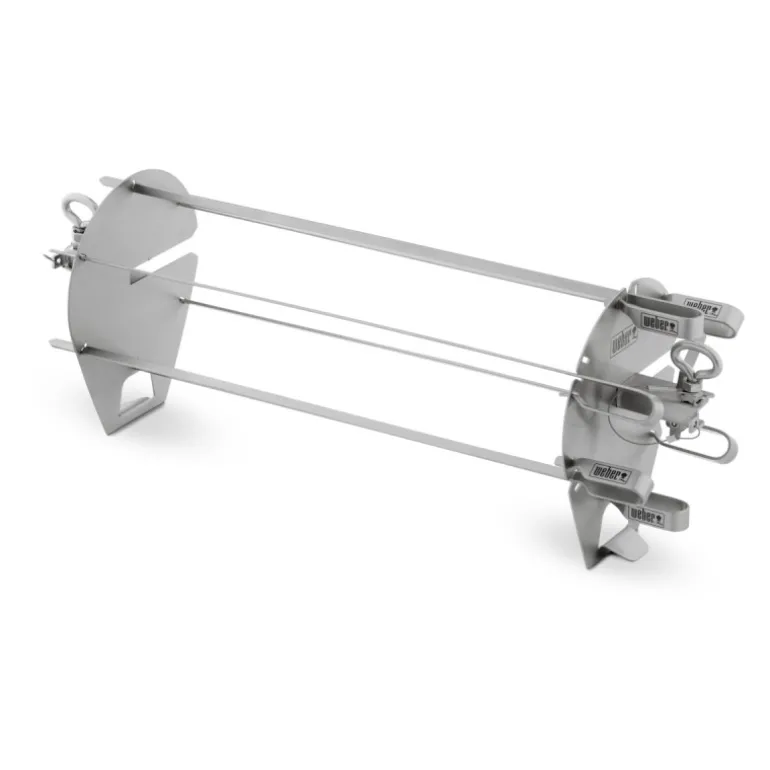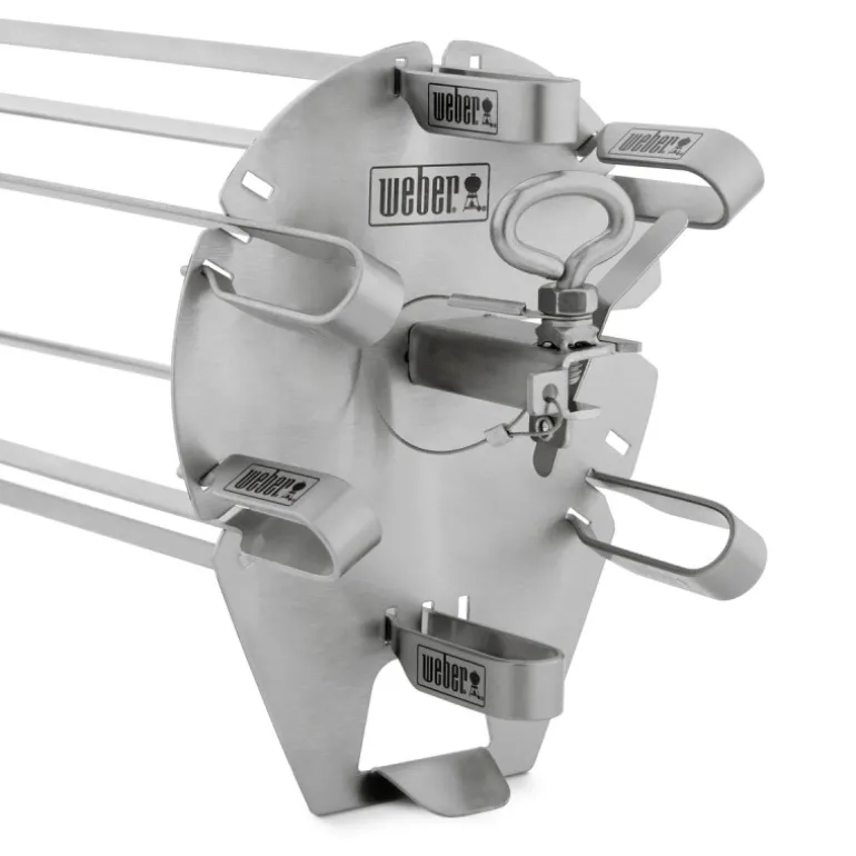 Il set di spiedini da 40 cm può essere facilmente inserito nell’asse del girarrosto. Perfetto per spiedini di carne, verdura o frutta. Il planetario consente di cucinare fino a sei spiedini alla volta che, grazie alla rotazione, saranno cotti uniformemente. Compatibile con tutti i girarrosti Weber.