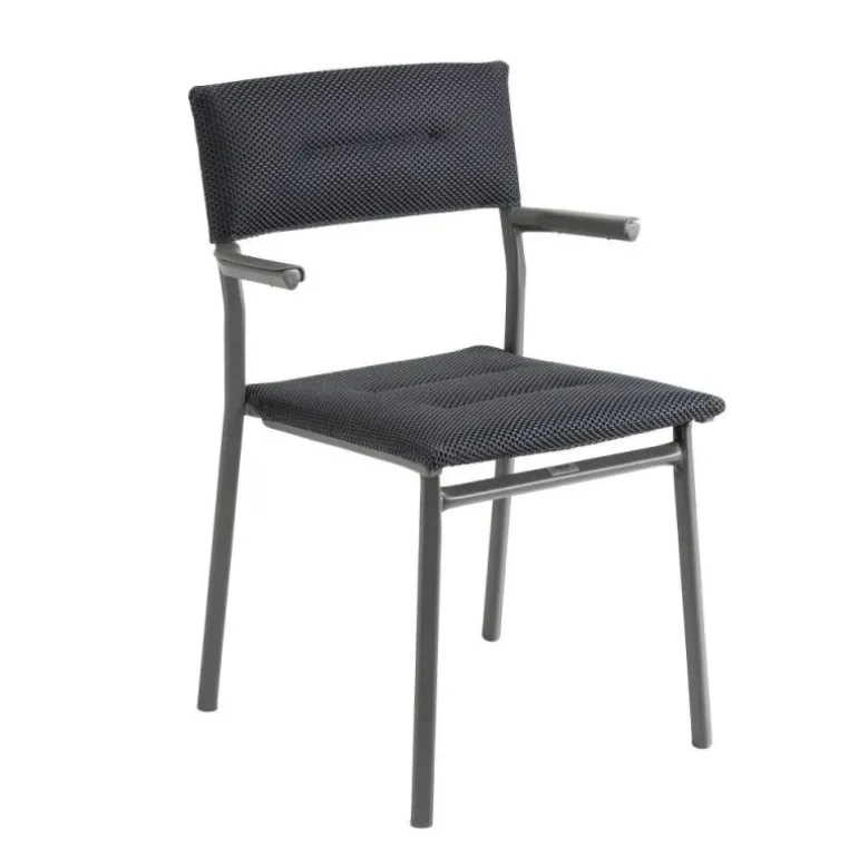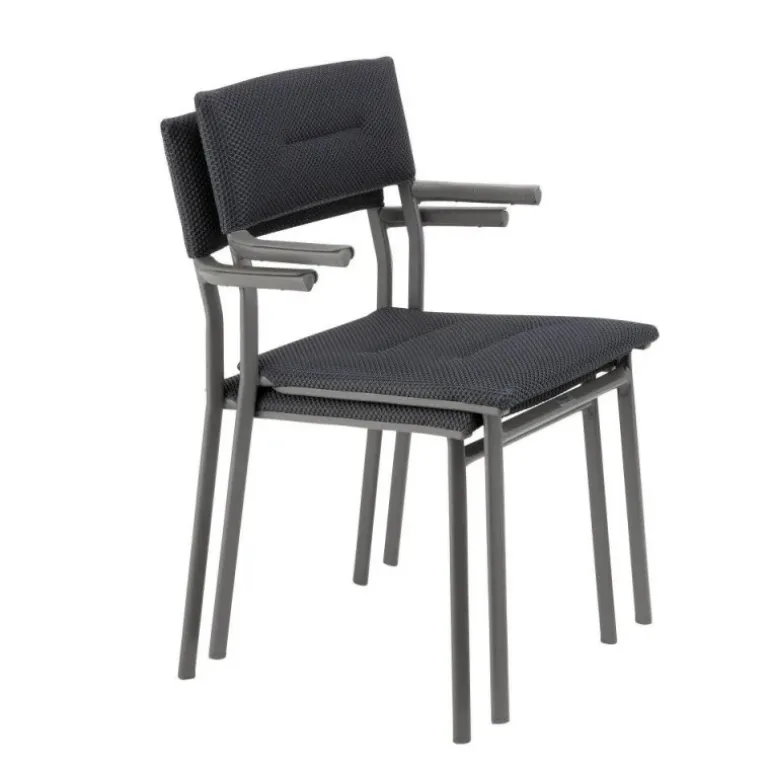 – Braccioli in alluminio ultraresistente con rivestimento in polimero puntinato ed effetto ondulato. Consente di sospendere la sedia dal tavolo per riporla facilmente o per la manutenzione del pavimento. Facile accesso alla sedia grazie ai braccioli di “media lunghezza”.