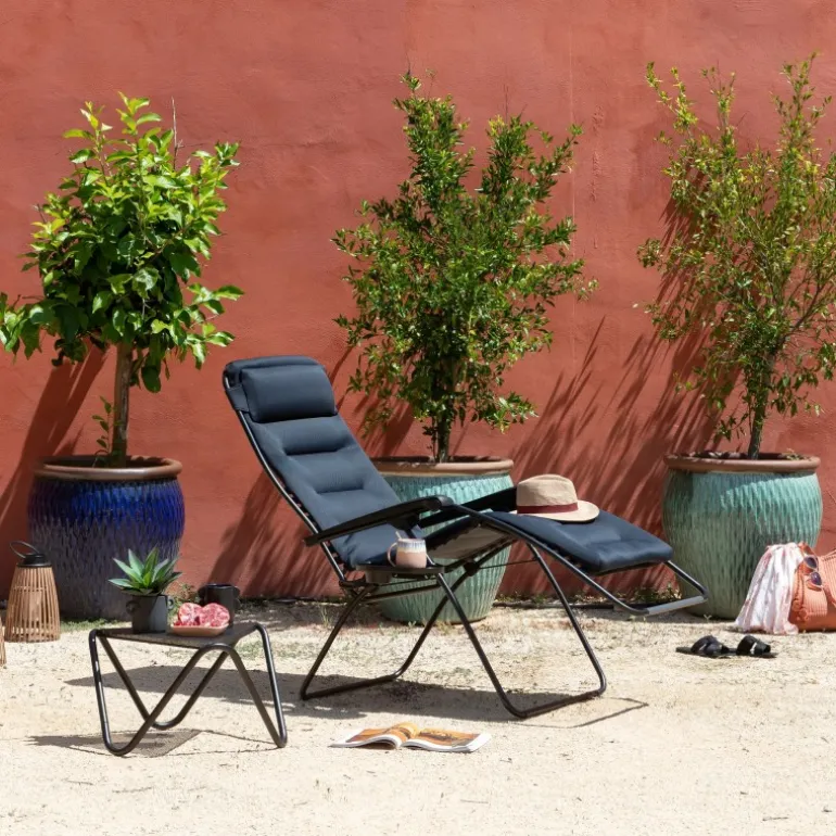 – Tela imbottita: AirComfort®, imbottitura a 3 spessori, traspirante, asciugatura rapida. Tela removibile e sostituibile con fissaggio tramite clip in elastomero (brevetto LAFUMA MOBILIER).