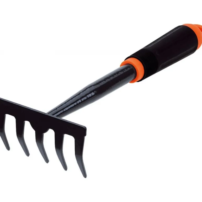 Rastrello a pettine piatto a 5 denti, ideale per leggeri lavori in giardino di raccolta foglie e detriti e livellamento, e per smuovere il terreno. – Struttura in acciaio verniciato lucido con smalto nero – Manico di plastica dura arancione e nera Lunghezza: 30 cm Lunghezza denti: 7 cm Peso: 212 g