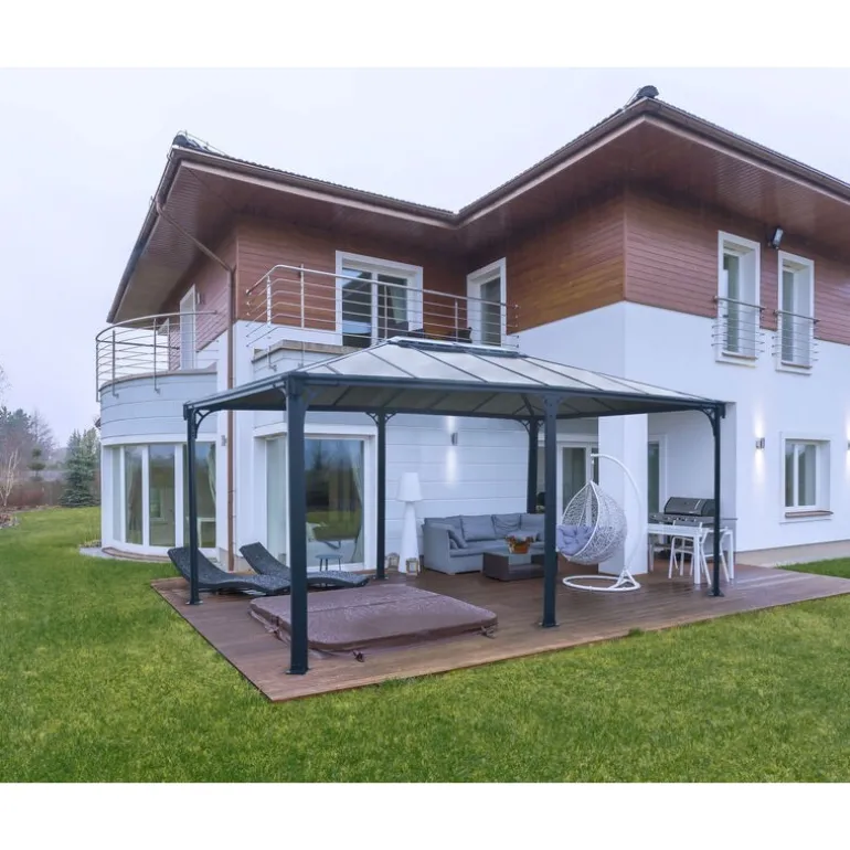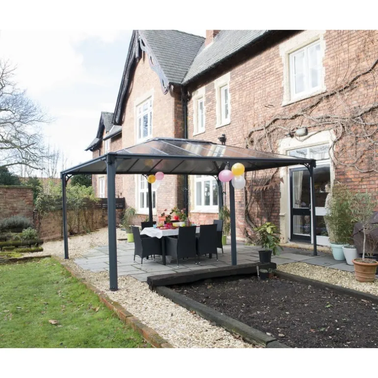 Scopri il Gazebo Canopia Martinique in Alluminio 3.6X5 m: eleganza e funzionalità per il tuo giardino. Resistente a corrosione, raggi UV, grandine e neve grazie alla verniciatura a polvere antracite e ai pannelli in policarbonato doppio. Perfetto per eventi familiari o relax estivo. Facile da installare, non necessita di manutenzione. Aggiungi un tocco di stile al tuo spazio esterno con Canopia!