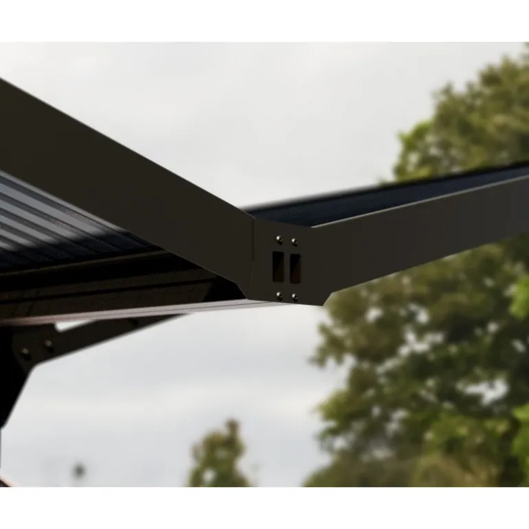 - Struttura Resistente: La struttura in alluminio è un robusto metallo rivestito di nero, resistente alla ruggine, e include grondaie integrate per dirigere l’acqua piovana.