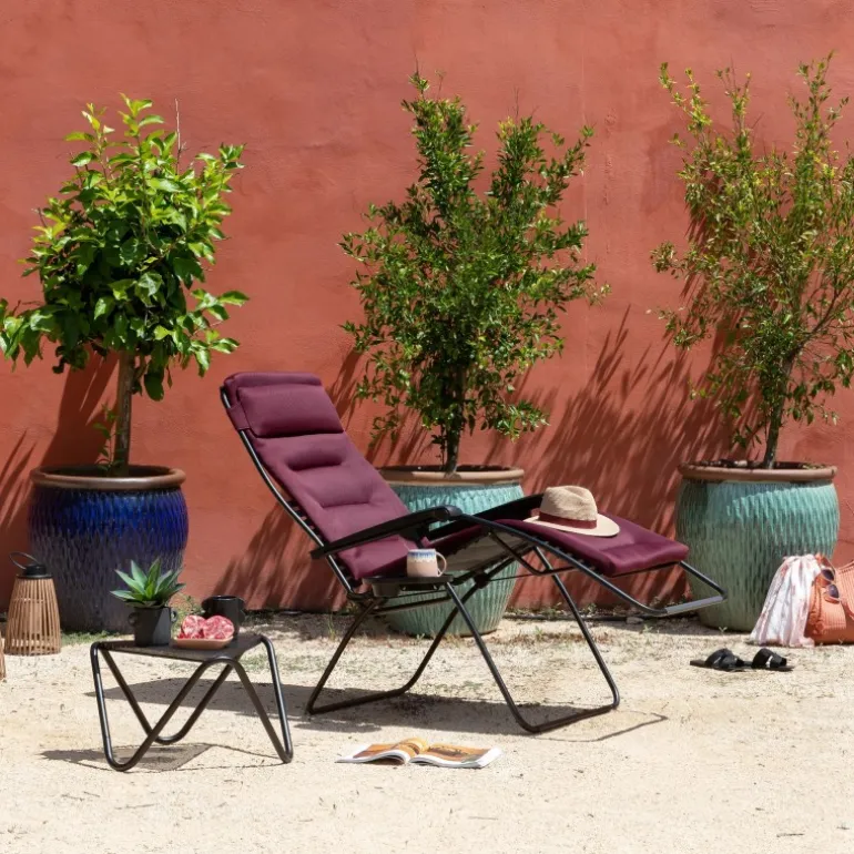 – Tela imbottita: AirComfort®, imbottitura a 3 spessori, traspirante, asciugatura rapida. Tela removibile e sostituibile con fissaggio tramite clip in elastomero (brevetto LAFUMA MOBILIER).