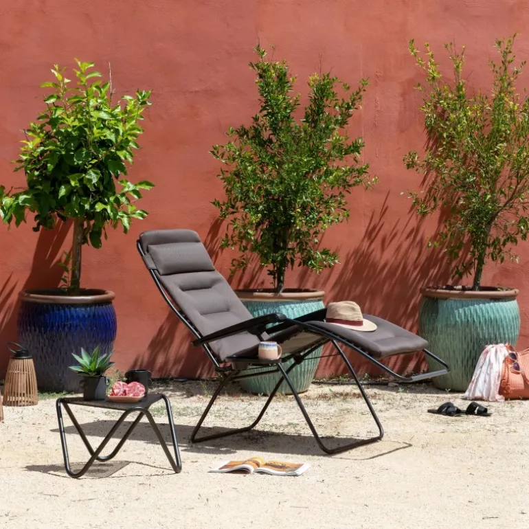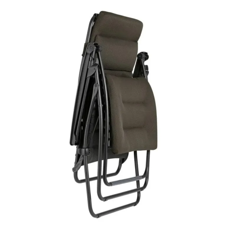– Tela imbottita: AirComfort®, imbottitura a 3 spessori, traspirante, asciugatura rapida. Tela removibile e sostituibile con fissaggio tramite clip in elastomero (brevetto LAFUMA MOBILIER).
