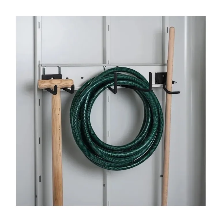 Set per Casetta NEO composto da un gancio multiuso per i manici degli attrezzi da giardino e una staffa a parete.