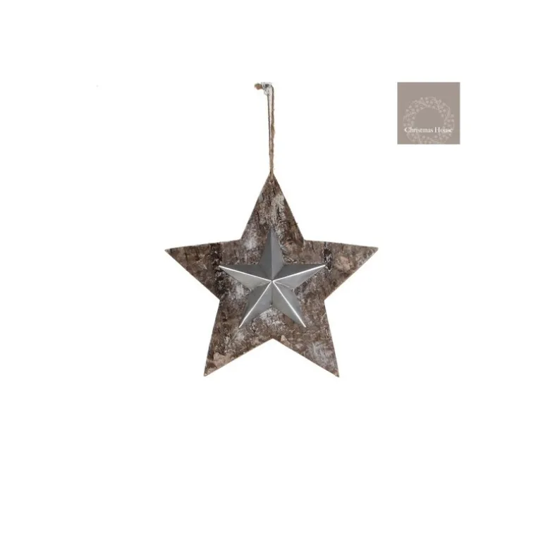 Stella in legno e latta da appendere h24,5 cm.