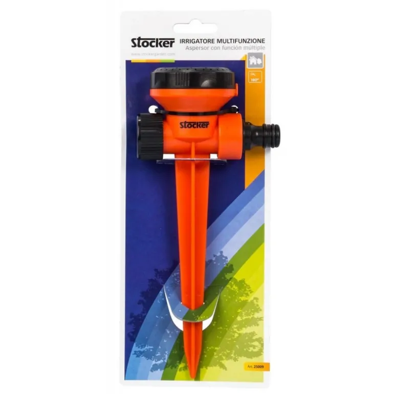Per irrigare piccole aree, aiuole e giardini. Ideale per superfici di massimo 100 m². – 5 ugelli differenti per 5 differenti getti dell’acqua – Getti regolabili in modo molto semplice ruotando il disco – Base in plastica – Con picchetto da inserire nel terreno La superficie irrigabile puó essere ridotta facilmente, tramite la riduzione del flusso d’acqua.