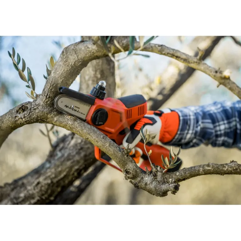 La motosega Magma E-100 LM 21V è una pratica e funzionale motosega a batteria. La presa ergonomica ed il peso ridotto, solo 1270 gr senza batteria, riducono lo sforzo e permettono all’operatore di non affaticare la mano.