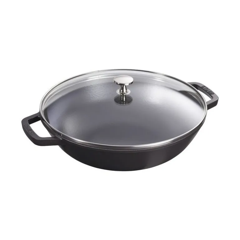 Wok con Coperchio in Vetro 30 cm Nero in Ghisa